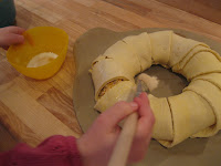 This recipe began as a Pampered Chef ring recipe I saw demonstrated at a Pampered Chef party. There are many recipes for these on the internet and on the Pampered Chef recipe page. They use croissant dough to make the pie and are really so easy to do. In fact, as you can see from the pictures my nearly 4 year old trainee chef, 'P' did most of the assembly. Most of the recipes I could find were American, which meant conversion of some of the measures and some ingredients, which are not familiar here in the UK. So here is my twist on the recipe, you can be quite experimental with this and add what you like, but you do need quite a dry filling or you will end up with soggy pastry.
